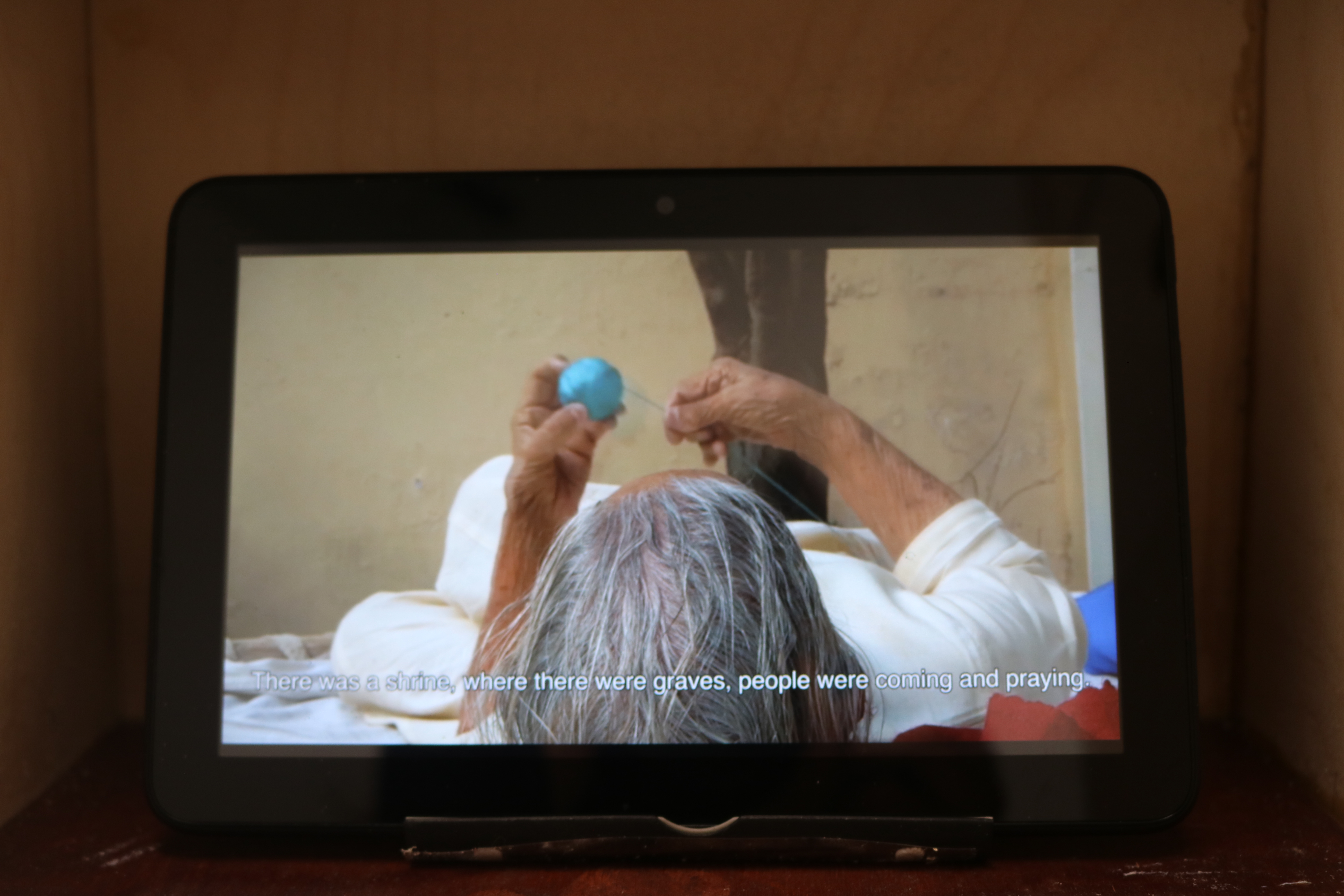 In the “Bachpan Ka Mela (Childhood Festival),” the artist’s 80-year-old Nani (grandma) tells her story of visiting a festival as a child with her cousins in Jalandhar in India–their hometown at that time. However, Nani was forced to migrate to Pakistan with her family as Muslims because of the Partition. She has not visited her childhood home since then. The other video, “Karkhana (The Factory)” (2022), presents Sayera’s mother’s memory of a village in Kasur, Pakistan. There used to be a factory surrounded by vast fruit fields owned by a prominent Hindu businessman. However, the factory was abandoned after the owner was forcibly returned to India and took parts of the machine with him. Both videos by Sayera narrate distant memories of the homeland and reveal the ongoing influence caused by migration.